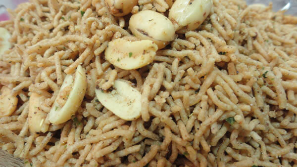 Rajgira Sev is made up of Rajgira Flour (Amaranth Flour). Rajgira flour is made from the seeds of the Amaranth Plant. It is blended with fried peanuts. Rajgira Sev can also be used in Religious Fast also.